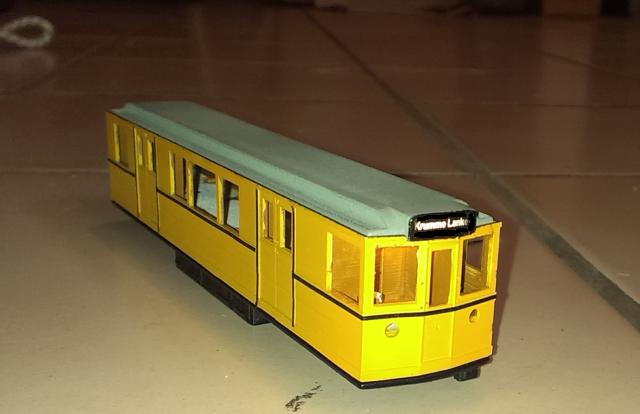 Da ich unbedingt wegen des Einsatzes der Fahrzeuge im Tunnel ein beleuchtetes Zielschild haben wollte, wurde ein bereits im Druck enthaltendes Loch auf 1,8mm aufgebohrt und von hinten eine warmweiße LED 0805 eingeklebt. Die Zielschilder selbst entstanden aus einem in meinem Offset-Studio belichteten, lichtdichten Film. Diesen habe ich zur besseren Stabilität auf zurechtgeschnittenen Umverpackung eines Reichelt-Lötkolbens geklebt und mit leicht transparanten weißen Papier hinterlegt. M.E. kommt der Effekt des Originals sehr zutreffend zur Geltung.